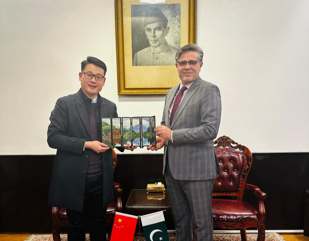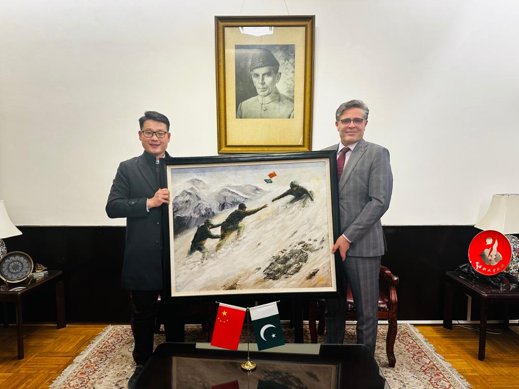 作品构图从左到右呈现出“一”字形上升状,寓意中巴关系稳固上升,画面整体氛围是在风雪中行进,也体现出中巴两国的“巴铁精神”。哈什米大使对作品给予了高度的评价,并向刘杰老师赠送了代表巴基斯坦地域特色的礼品。