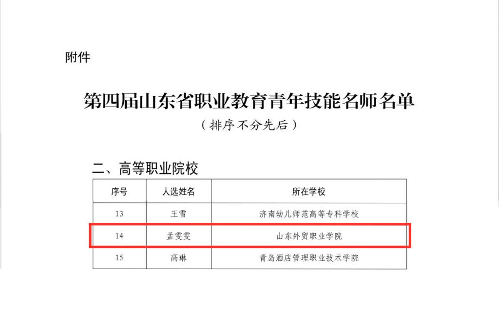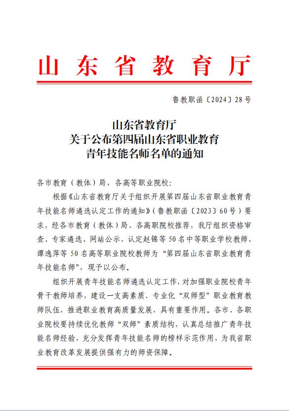 6月7日,山东省教育厅印发《关于公布第四届山东省职业教育青年技能名师名单的通知》(鲁教职函〔2024〕28号),今年会官网跨境电子商务系教师孟雯雯获评第四届山东省职业教育青年技能名师。