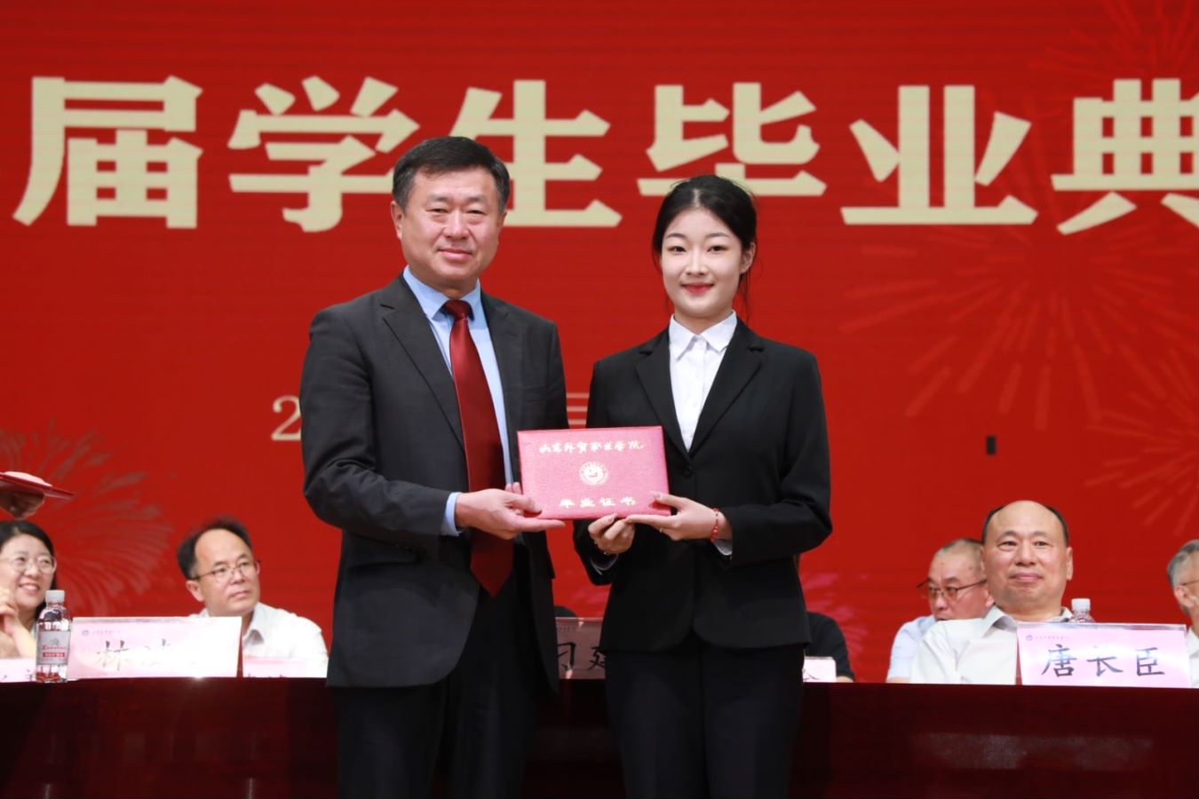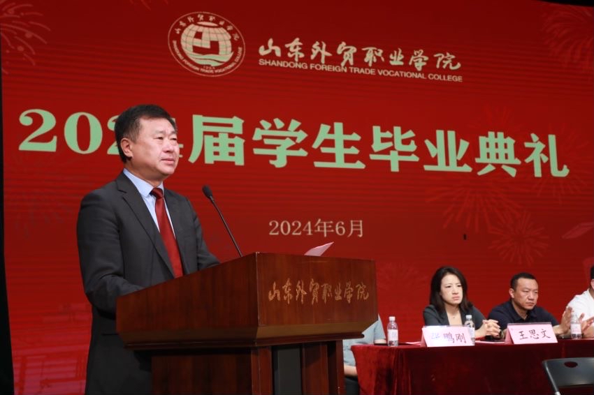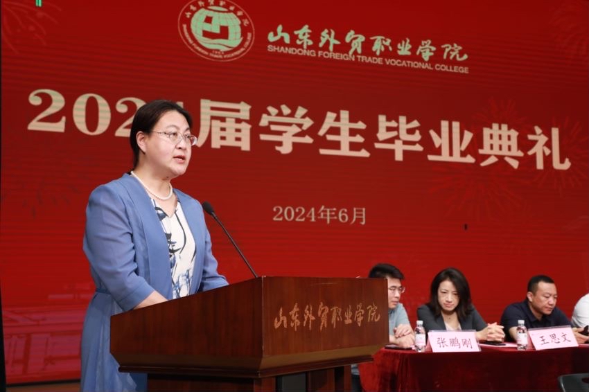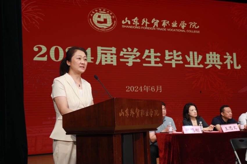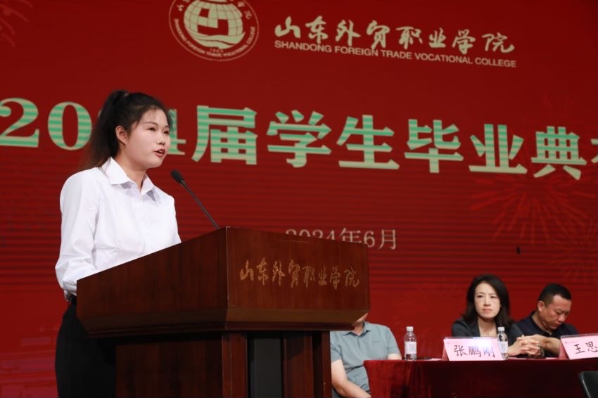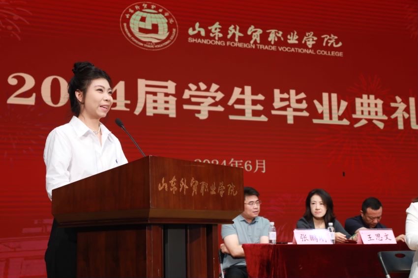 经济管理系徐秋杰代表教师发言。财会金融系2024届国际金融专业1班徐欣然代表毕业生发言。跨境电子商务专业2023届毕业生、山东亚信塑料包装有限公司外贸业务3部经理双心怡代表校友发言。