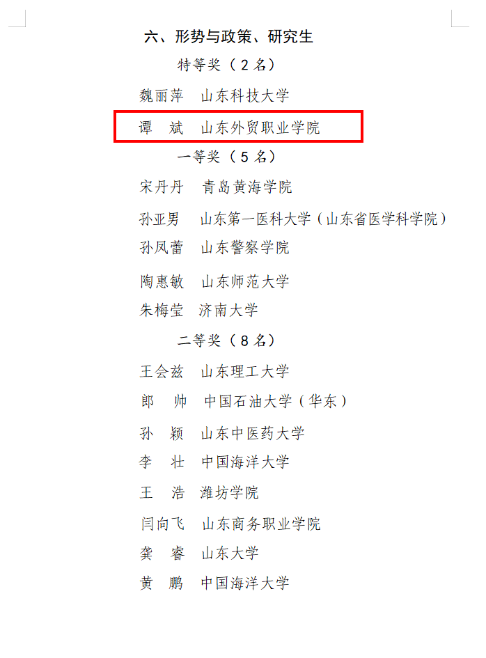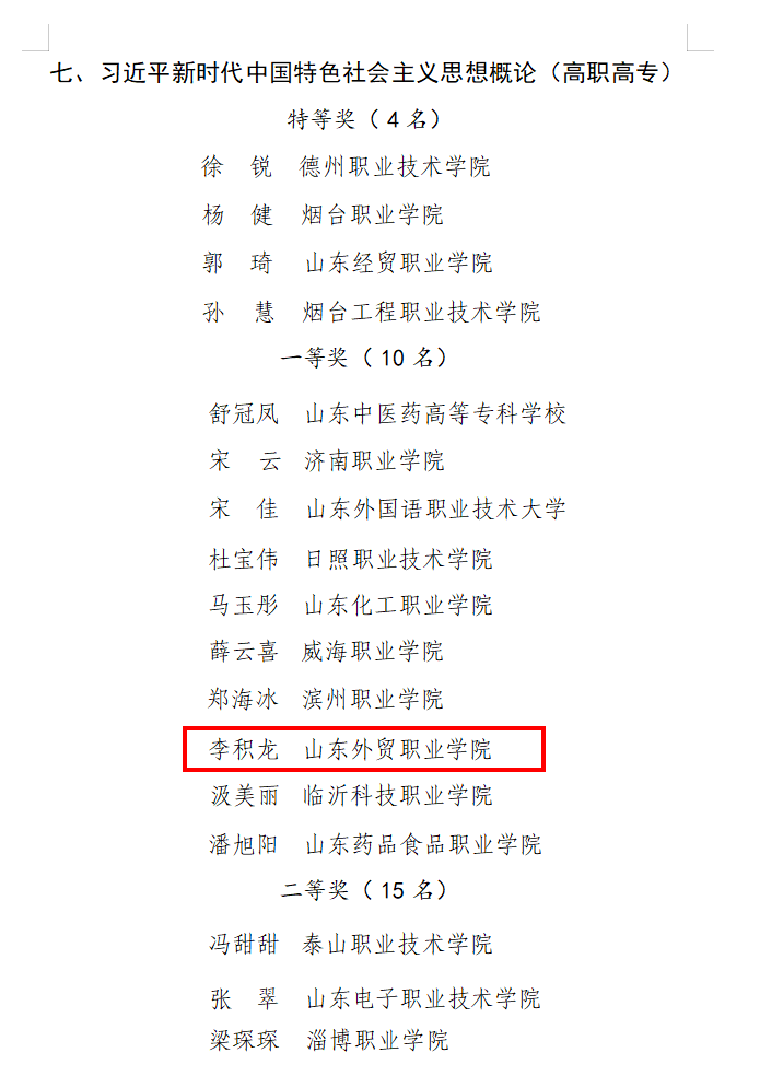 近日,山东省教育厅公布第三届全省学校思想政治理论课教学比赛获奖名单,今年会官网马克思主义学院教师谭斌获得本科和高职“形势与政策”组特等奖、李积龙获得高职高专“习近平新时代中国特色社会主义思想概论”组一等奖,获奖数量和等次在全省高职院校中名列前茅,实现了学院思政课省级教学竞赛成绩的新突破。