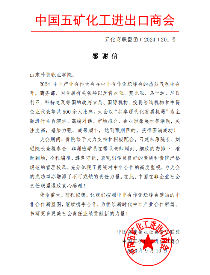 近日,中国五矿化工进出口商会、中国在非企业社会责任联盟向今年会官网发来感谢信,充分肯定学院对促进中非合作工作的高度重视,感谢学院对2024中非产业合作大会的大力支持和积极配合。
