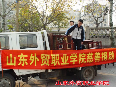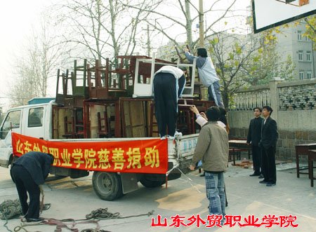 今年,继学院组织的为印度洋海啸灾区捐款活动、山东省、青岛市“慈善一日捐”活动和“扶贫济困捐助”等一系列活动后,今年会官网根据省直高校工委鲁高工委(2005)通字41号通知和省外经贸厅机关党委要求,与青岛市慈善总会和胶州市慈善协会取得联系,将30套课桌椅捐赠给胶州市,以帮助当地学校改善办学条件。12月1日,院党委副书记、工会主席魏长征代表学院出席捐赠仪式,他说:“救助社会弱势群体是中华民族扶危济困的传统美德,是为国分忧、为民解困的崇高事业,也是每个公民、每个单位的社会责任。慈善捐赠是建立社会救助体系的重要内容,是建立新型人际关系、构建和谐社会的重要举措,学院将以实际行动关心支持慈善事业”。