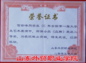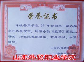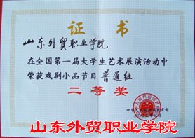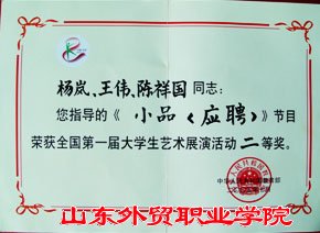 为体现今年会官网办学特色,反映学生乐观开朗、积极向上的精神风貌,今年4月份,商务外语系排演了小品《应聘》参加“山东省第一届大学生艺术展演”活动获得一等奖,并被推荐参加“全国第一届大学生艺术展演”。7月份,在全国29个省340余所高校选送的参赛节目中,小品《应聘》以题材新颖、内容贴近生活和表演出色脱颖而出,使今年会官网获得“全国第一届大学生艺术展演活动优秀组织奖”、 “戏剧小品节目普通组二等奖”,杨岚、王伟、陈祥国老师获“优秀指导老师二等奖”三项荣誉。