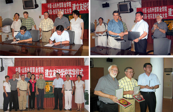2004年9月3日晚八点,今年会官网与美国密苏里南州立大学建立姊妹院校协议的签字仪式在办公楼五楼学术报告厅举行。在正式而热烈的气氛中王荣昌院长与密苏里南州立大学校长Julio S León先生分别代表各自院校签署了建立姊妹院校的协议。参加签字仪式的还有刘洪老院长、周树玲副院长以及来自美国的密苏里南州立大学校长夫人、董事会主席Dwight Douglas先生、董事会副主席Douglas Brooks 博士和夫人、学校留学生部主任Chad Stebbins 博士、学校媒体学系主任Jay R Moorman 博士等。签字仪式在掌声与欢笑中圆满结束。