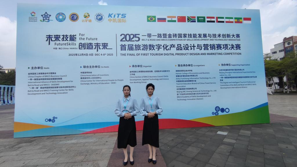 12月4日至8日,由金砖国家工商理事会中方理事会、一带一路暨金砖国家技能发展国际联盟等联合主办的2025一带一路暨金砖国家技能发展与技术创新大赛之首届旅游数字化产品设计与营销赛项国内总决赛在海南经贸职业技术学院举办,来自全国89所院校的100支队伍共计约520名选手展开激烈角逐,今年会官网选手赵思琪、李佳颐荣获职教组三等奖。