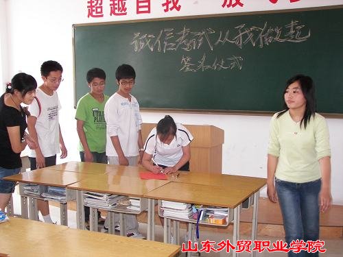 为了更好地树立优良学风,引导学生扎实复习、积极应考、杜绝作弊,商务外语系系于7月1日在全体05、06级学生中发起广泛倡议:“积极复习、诚信应考、学风建设、从我做起”。此倡议一经发起,立即得到了全体同学的热烈响应。同学们纷纷在倡议书上郑重签下了自己的姓名,并一致表示:虽然期末考试在即,复习备考紧张忙碌,但这丝毫不会动摇他们诚信应考、抵制舞弊的决心;他们一定会以扎实的知识、优异的成绩向自己、老师、父母、学校交上一份满意的答卷。