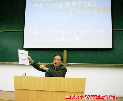 11月22日晚,国贸系邀请了山东省五金矿产进出口公司刘大为副总经理,为04级同学做了题为“毕业生就业指导系列之一——你的岗位在等你”的讲座。