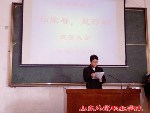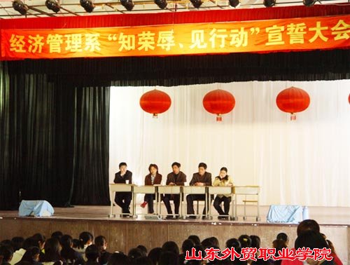 春风化雨,润物无声。要树立新时期的道德观,必须使“八荣八耻”沁入心灵深处,融化在实际行动中。3月27日,经管系党总支召开全系入党积极分子和主要学生干部党员学习胡总书记讲话精神动员会,就下一阶段开展新时期社会主义荣辱观教育进行动员和布置。3月30日,经管系团总支组织主题团课,以班级为单位展开了社会主义荣辱观教育大讨论。同学们畅所欲言,联系实际,就大学生如何践行社会主义荣辱观畅谈了自己的看法。4月6日,在同学们广泛讨论的基础上,经管系党总支组织全系学生,按专业划分为四个会场,举行以“知荣辱 见行动”为主题的宣誓大会。党委副书记魏长征副同志、经管系副主任陈丽、系党总支孙中平老师等在大学生活动中心的主会场与同学们共同进行了宣誓。在下一阶段,经管系将举行辩论会和演讲会,进一步推进和深化社会主义荣辱观教育。