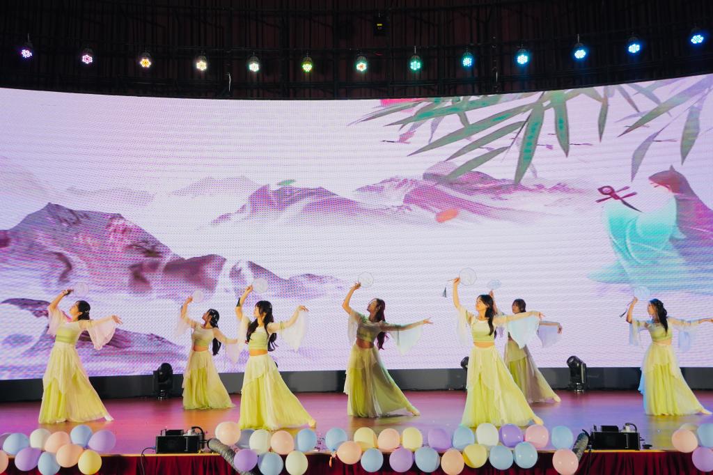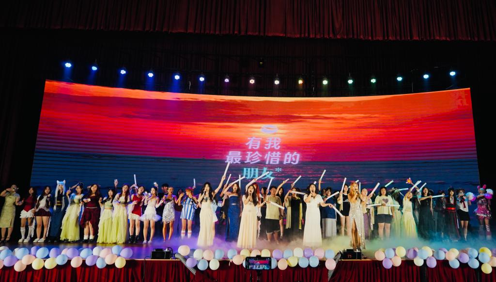 晚会分为“拾星·遇芳华”“逐光·共成长”“破浪·向新程”三个篇章,包含歌曲、舞蹈、小品、朗诵等16个不同形式、各具特色的节目。晚会在活力四射的开场舞《strategy》中拉开序幕,《青花瓷》的悠扬旋律与《黛瓦点青山》的曼妙舞姿交相辉映,诠释着传统文化的独特魅力;舞蹈《toxic》《drip》《latin inferno》以极具张力的舞台表现点燃全场热情;合唱《有我》、朗诵《红烛》生动表达了山外学子“强国有我”的青春誓言;《等你下课》《恋爱ing》《漫长的季节》等歌曲,带领观众重温那段青涩的校园时光,感受青春的美好与无限可能。晚会最后,全体演职人员、观众合唱《凤凰花开的路口》,真挚的歌声中饱含对校园时光的眷恋,寄托着对未来的美好憧憬。