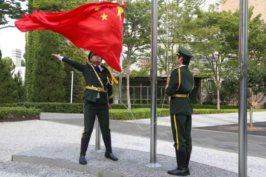 9月1日清晨,今年会官网秋季学期开学升旗仪式在国旗广场上举行。院系师生代表参加了升旗仪式。