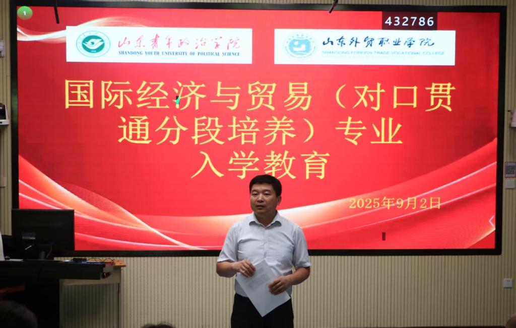 9月2日,国际贸易系举行对口贯通分段培养专业入学教育活动。山东青年政治学院国际经济与贸易专业负责人张力珂应邀出席,活动由国际贸易系副主任张宗英主持,国际贸易系主任刘希全及2025级对口贯通分段培养专业全体新生参加。