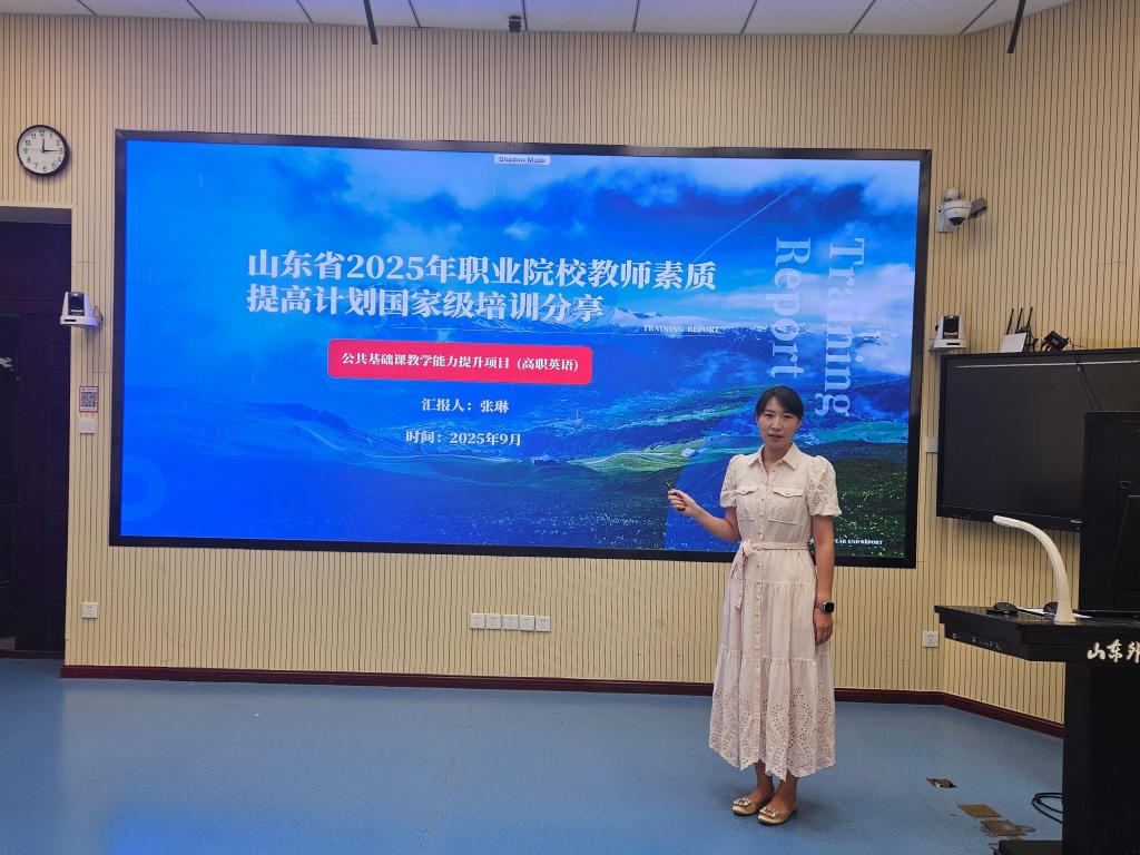 张琳以高职英语教学能力提升与数智化实践为核心,围绕其参加的山东省2025年职业院校教师素质提高计划国家级培训内容展开分享。她重点聚焦“五金新基建”背景下的产教融合路径,深入解读产出导向法(POA)、BOPPPS教学模式的创新应用场景,演示如何通过“目标设定——任务驱动——效果评估”的闭环设计提升课堂效率。此外,介绍技术赋能与德育融合的双重重要性,借助数字化工具搭建“英语+职业素养”的教学平台,在语言教学中渗透工匠精神与家国情怀,为职业教育高质量发展提供“理念+路径”的双重参考。 杜德春则围绕2025年暑期全国高校外语教学研究与教师发展系列研修班的学习内容,带来多维度的经验分享。她系统梳理了研修班三大核心专题的精华内容:详细介绍了大语言模型在词汇教学、写作批改、个性化测评中的应用实例;结合公共英语教学实际,深入解读从教材内容挖掘、课堂活动设计、第二课堂延伸三个层面推进“三进”工作,让思政元素自然融入语言教学;演示了U校园AI版的互动课件制作、实时学情分析、小组协作任务布置等功能,为教师们提供了可直接借鉴的数字化教学模板。除研修班内容外,杜德春还分享了暑期观摩“教学之星”大赛的心得。