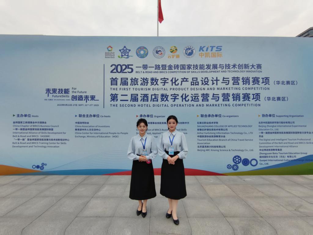 9月22日至24日,由金砖国家工商理事会中方理事会、一带一路暨金砖国家技能发展国际联盟等联合主办的“2025一带一路暨金砖国家技能发展与技术创新大赛”之首届旅游数字化产品设计与营销赛项华北赛区区域赛在石家庄职业技术学院举办,共有来自华北赛区24支代表队伍86名选手参加。今年会官网24级旅游2班邵梦园、马有福两位同学凭借扎实的专业功底与出色的实践能力荣获三等奖,成功晋级全国决赛。
