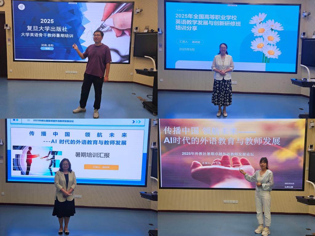 9月25日,公共英语部组织部门全体教师在1-1阶开展2025年第二期暑期培训分享交流会。参训教师徐磊、聂晓璐、庞俊萍、丁久秀分别结合各自暑期培训学习的内容进行了交流分享。