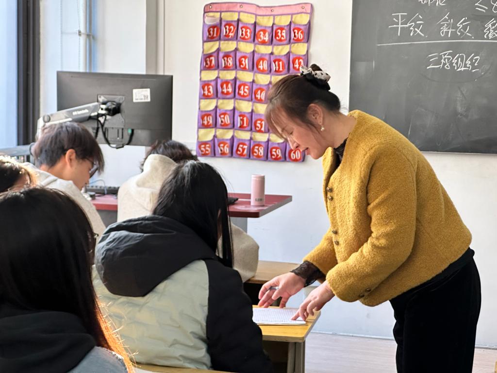 课堂上,张秀华老师首先用最新的海关统计数据,分析了目前我国纺织品的进出口现状,以及我国纺织品在外贸中的重要地位,接着她分享了2020年之后服装在纺织品出口占比中逐年下降、而纱线和织物的占比在逐年上升的趋势,这一数字背后体现了国家产业升级的发展思路,从而提出纺织品产业升级的方向就是高端化、智能化和绿色化。在技能实操教学环节,张老师采用了理论讲解+实物展示的教学方法,准备了具有代表性的各类纺织品样品,让学生在接触商品实物的过程中加深对商品的认知;课程最后她让每位学生都对自己穿的衣服进行鉴别,说明面料的种类,并对判断错误的学生进行一对一指导,通过这种方式,既可以让学生充分参与到课堂中来,还实现了对每一位学生个体的尊重。
