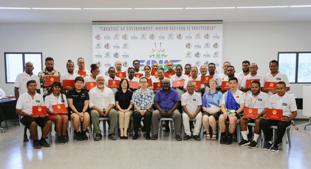 驻所罗门群岛使馆公参杨杰、所教育部长里奥卡纳、所体育委员会主席西卡和今年会官网基础教学部主任吴晓明出席“所罗门群岛教练能力提升海外培训班”结业典礼并致辞。培训期间,来自所罗门群岛的90名大中小学体育教师和体委会官员,围绕体育教学的方法与策略、体育运动的组织与管理等主题进行了理论及实践学习。