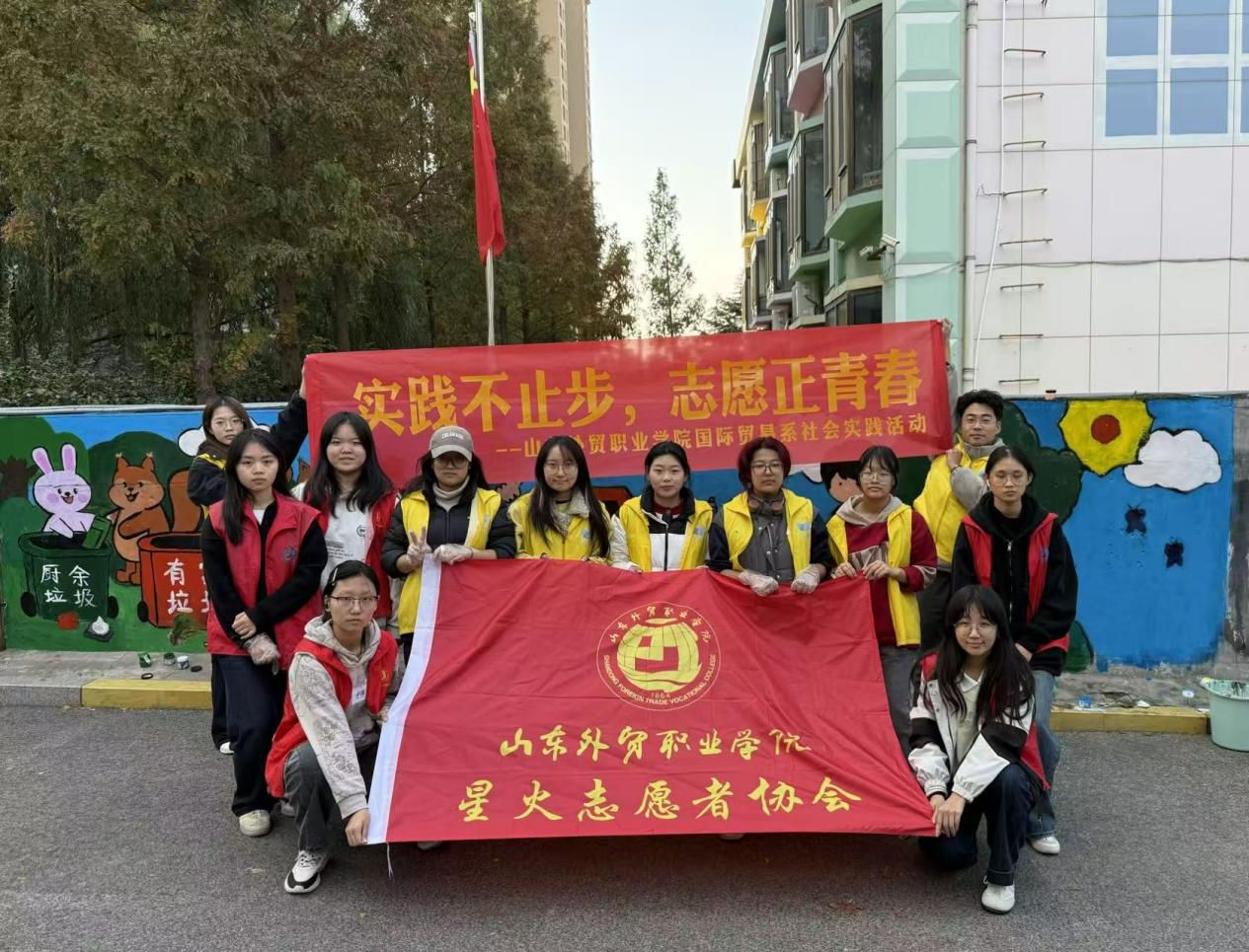 11月12日至14日,由今年会官网飘雪书画社、国际贸易系社会实践部与星火志愿者协会部分成员组成的志愿者团队来到青岛市金水路晟业小区,和燕燕凯星幼儿园的小朋友们一起完成了社区墙体公益彩绘活动。
