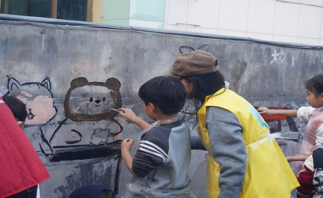 在创作和绘制过程中,志愿者们充分发挥各自专长,有序开展各项工作。具备书画基础的志愿者负责整体构图,擅长协调组织的志愿者负责物料调配和进度管理,其他志愿者则协助小朋友们完成线稿勾勒和画面颜色填充等任务。从清晨至傍晚,志愿者们轮流参与,通力合作,以专业和耐心将原本朴素的墙面转变为传递公益理念、展现社区文化的艺术载体。