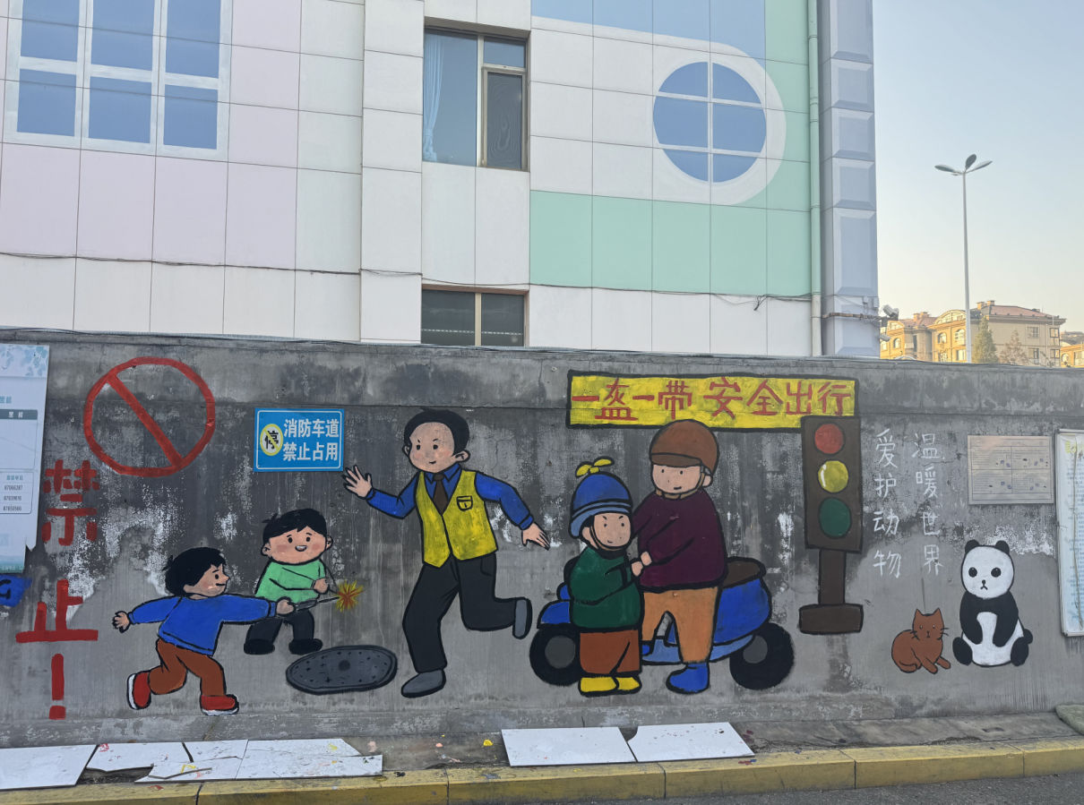 此次墙绘主题聚焦“安全科普”,将“禁止燃放烟花爆竹”“一盔一带”“爱护动物”等内容,通过生动有趣的画面传递给过往居民,增强大家“安全无小事,文明记心间”的意识。这种富有童趣与艺术感的表现方式,让冰冷的墙面变成会“说话”的文明课堂,既美化了社区环境,也将实用的公益知识悄然送入人们心中。