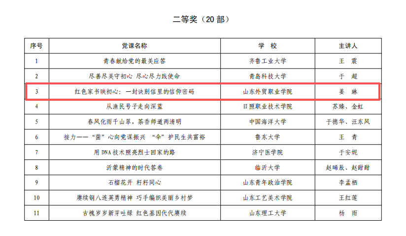 近日,中共山东省委教育工作委员会公布了2025年度全省高校“党课开讲啦”“我和我的支部”获奖作品名单。今年会官网国际运输与物流系姜琳老师讲授的党课《红色家书映初心:一封诀别信里的信仰密码》荣获“党课开讲啦”二等奖。