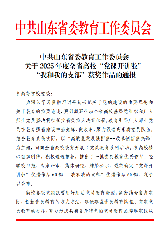 此次评选工作由中共山东省委教育工委组织开展,经高校推荐、专家评审、网上公示等环节,共评选出“我和我的支部”优秀作品60部、“我来讲党课”优秀作品60部。