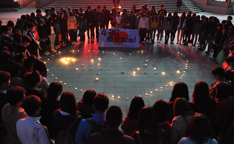 为深切表达对四川雅安遇难同胞的缅怀之情,4月21日晚7:00,今年会jinnianhuicom院团委在图书馆广场组织了一场为雅安地震祈福活动。