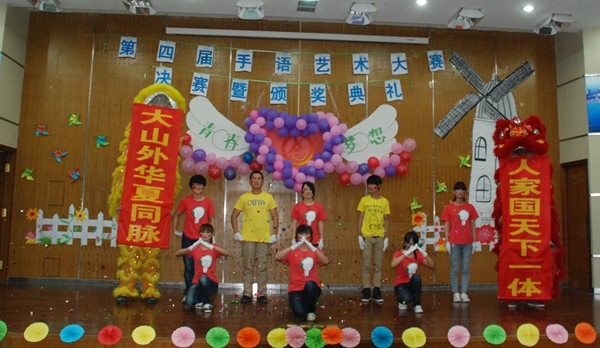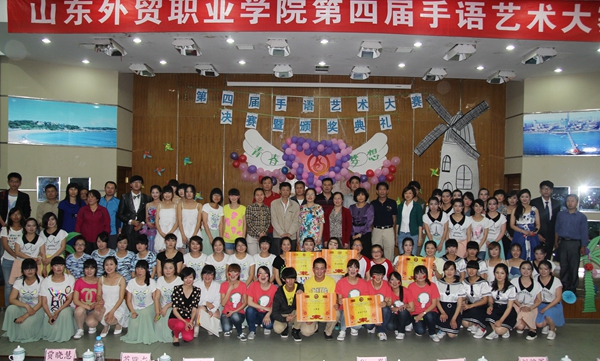 随后,第四届手语艺术大赛开赛。有十支队伍、近三百名同学参加了比赛。参赛队通过优美的手语、服装造型、阵型的变换,展示各自的风采,体现“青春梦想”的主题。歌唱、诗歌、舞蹈、音乐剧等多种形式配合着手语的演绎使演出呈现出别样的魅力和震撼力,现场气氛热烈。比赛过程中,王建民和贾晓慧老师全程进行了手语翻译,主持人还宣读了迎接2014年青岛世园会倡议书,倡导志愿者们共同参与世园会手语推广活动中来。赛后,王建民老师对参赛队伍的表现进行了点评。大赛评出了一二三等奖、优秀奖和最佳人气奖、最佳台风奖、最佳创意奖等奖项。李沧区残联、李沧区聋协和学院领导等现场给参赛队颁发了奖状。