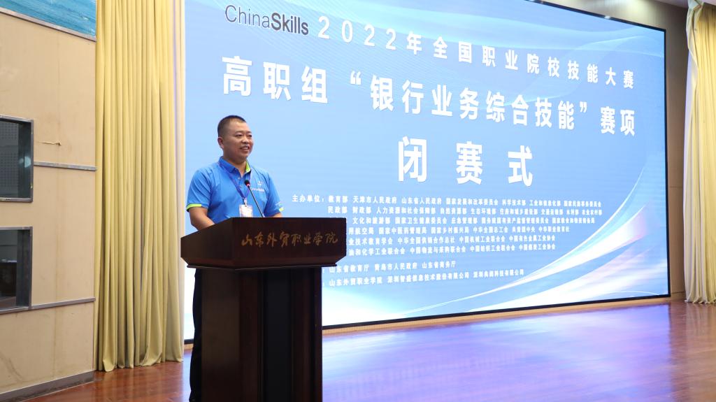 8月15日下午比赛闭幕,山东省商务厅二级巡视员李新运,青岛农商银行行长刘宗波等领导、专家出席闭幕式并为获奖队伍的师生颁奖。赛项专家组组长张庆伟对本次比赛进行了点评。