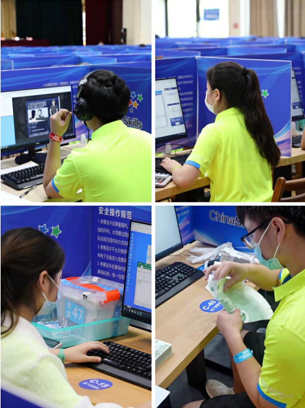 本次比赛内容由“银行核心业务岗位操作”“业务素养”“业务技能”“金融科技业务操作”四个项目组成,涵盖银行大堂经理岗、综合柜员岗、客户经理岗、理财经理岗的业务处理流程及规范的掌握情况以及金融科技业务分析处理能力。其中,“金融科技业务操作”作为今年首次引入的项目,对接行业前沿,融入了数字人民币、大数据金融、AI金融、云金融、物联网金融、区块链金融、银行业金融科技、证券业金融科技、保险业金融科技、监管科技等相关业务专业技能知识。赛场上,选手们凝神聚力,沉着冷静,展现出高超的技术技能素养和专业自信。