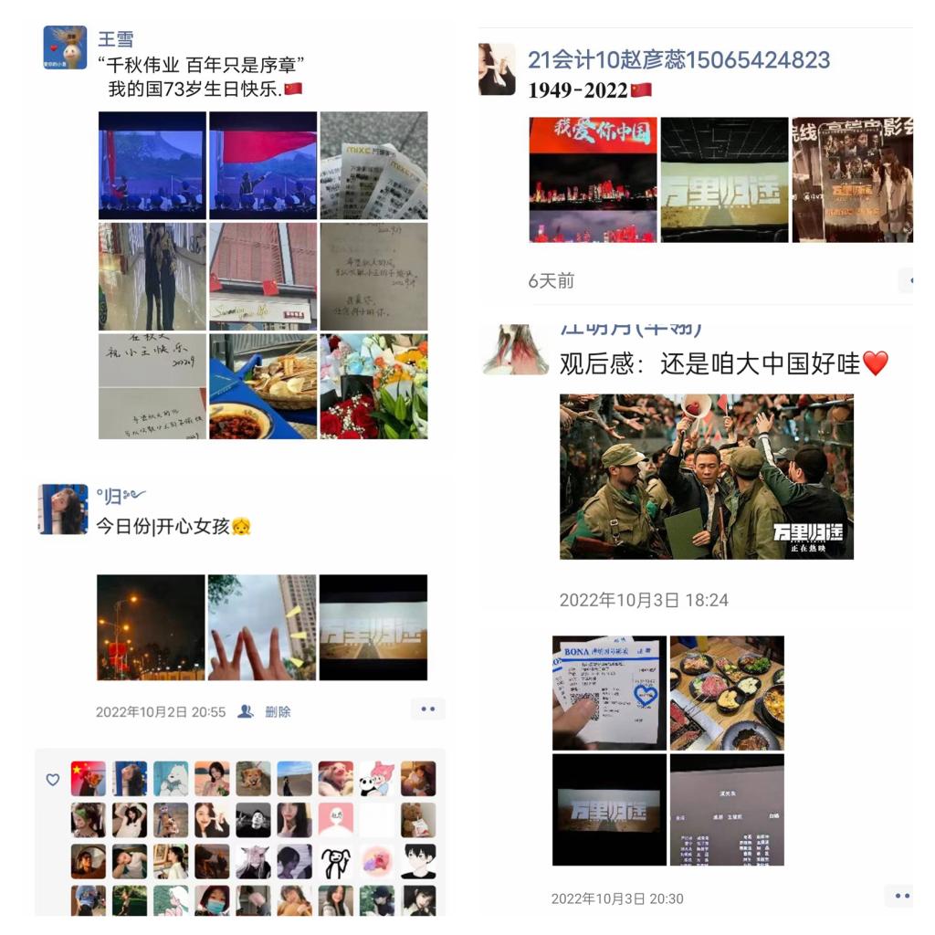 国庆假期,同学们也自发走进影院观看了根据真实事件改编的一段聚焦中国外交官撤侨幕后不为人知的撤侨故事《万里归途》。也有同学在学院准备的展板内打卡为祖国母亲庆生。