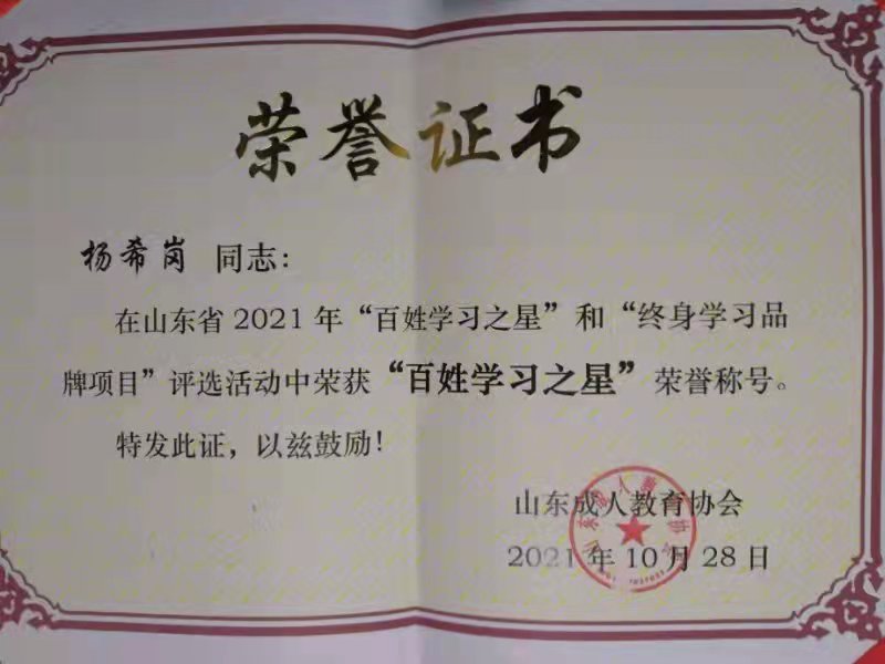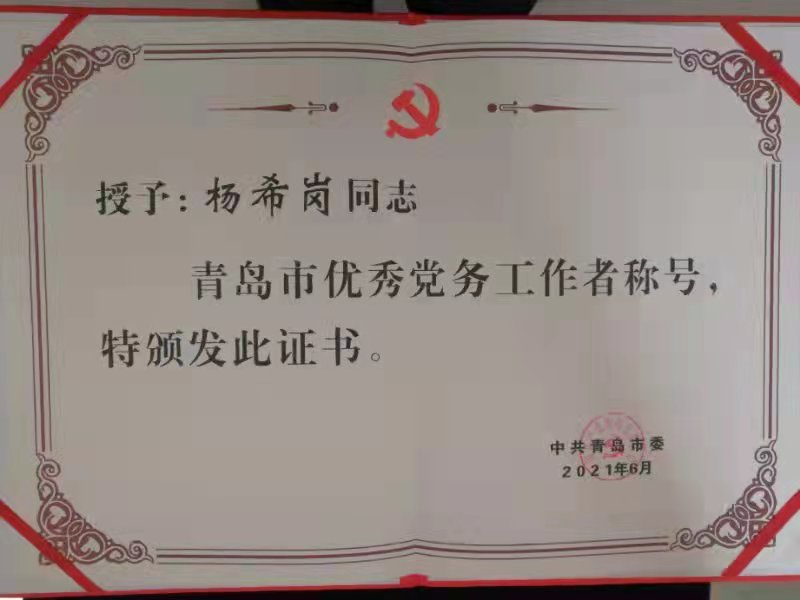 从学习党史的重要意义,到百年党史的重大节点,他用生动的语言和澎湃的激情讲解的有思想、有温度、有情感,内容高度凝练又鲜活生动。至此,杨希岗同志的2021年100场党史党课宣讲“小目标”圆满完成。因成绩突出,杨希岗被中共青岛市委授予“青岛市优秀党务工作者”荣誉称号,被山东成人教育协会授予“百姓学习之星”荣誉称号。
