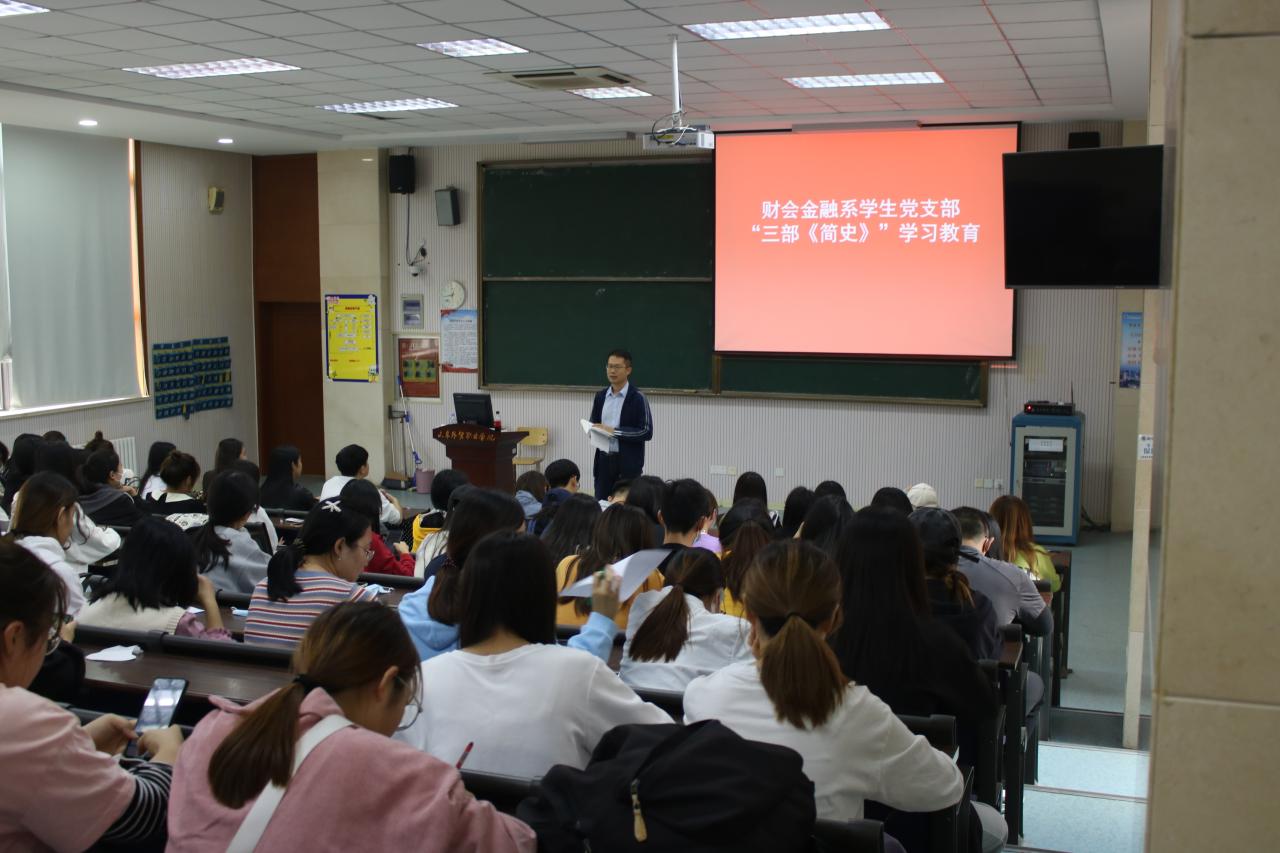 为进一步推进党史学习教育走深走实,近日,财会金融系学生党支部在2号教学楼B2阶梯教室举行了三部《简史》学习教育主题党日活动。活动由支部书记宋祥勇主持,学生预备党员、党员发展对象以及入党积极分子参加。