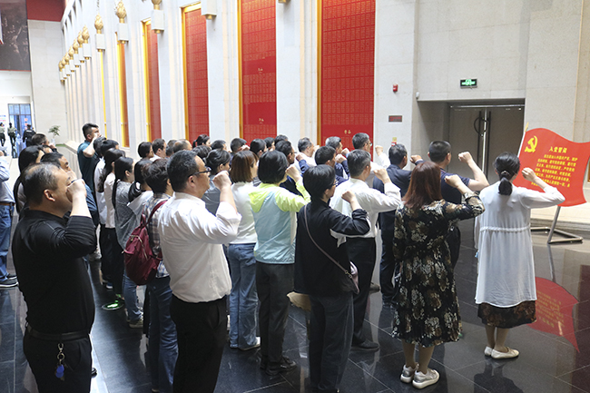 在鲁中抗日战争纪念馆,结合革命文物,讲解员客观真实为大家讲述了日本帝国主义对鲁中人民所犯滔天罪行以及鲁中地区党政军民在抗日战争时期所做的突出贡献。参观完鲁中抗日纪念馆,在一楼南大厅,全体人员面对鲜红的党旗,庄严宣誓。一句句铿锵有力的誓言,声声入耳,字字入心。重温入党誓词,既提醒了每一位党员“不忘初心、牢记使命”,也激励着党员们继承革命传统,坚守理想信念,砥砺前行不懈奋斗。